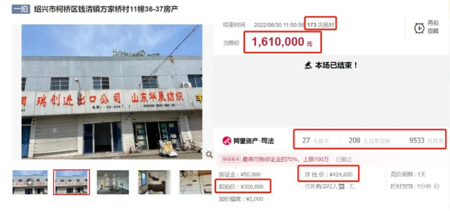 而还有更“夸张”的,钱清轻纺原料城旁的方家桥村一处营业房,则直接溢价约437%成交,161万的成交价相比约42.5万的市场评估价,高出了近119万元。