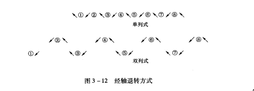 (2)浆纱机轴架上的退转方向:经轴在浆纱机轴架上的退转方法有单列式利双列式两种。经轴退转方式如图3—12所示。