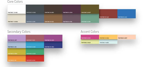 虽然我们仍然认为核心系列是基于中性的,但我们开始看到更有表现力的色调得到呈现。上面一排有更多的传统秋/冬季应用,而下面一排则显示了上方每一种颜色的矿物对应物。这些矿物色调将在春/夏季节的核心色彩应用中更加突出。