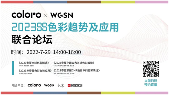 2022年7月29日14:00,由coloro主办,WGSN联合主办,衣架和顾家家居支持的“2023SS色彩趋势及应用联合论坛”将采用线上直播的形式与大家见面,会上将发布2023SS的关键流行趋势色及广泛领域的应用,除此之外还会带来全新的色彩分析工具,帮助大家深度拆解色彩的秘密。