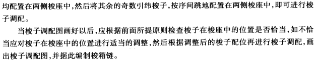 (4)强捻纬纱或结子纬纱,好配置在第2梭箱或第3梭箱;如果纬纱配色循环中打两种结子纱。则应间隔配置在梭箱中,以防止纬纱相互纠缠,并避免将不应织入的纬纱带入梭口。