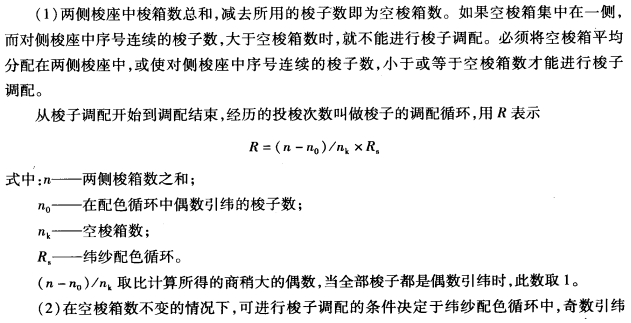 所谓能进行调配,即在整个调配过程中,每种纬纱的梭子都有适当的梭箱被其利用。并且当所有的梭子都已回到各自原来的梭箱时,恰好完成几个(正整数)纬纱配色循环。能进行梭子调配,说明具有这种纬纱配色循环的织物,能在某一特定的织机上织制。相反,不能进行梭子调配,就是不能在织机上进行织造。织物能否在织机上织造,还需满足以下几个条件: