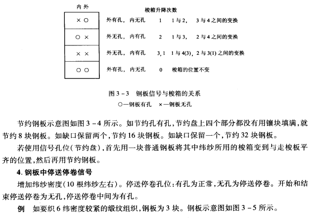 钢板的作用是控制梭箱变换的规律,使梭座按照织物的纬纱配色循环变换梭箱的位置。在单侧多梭箱中,每块钢板控制2根纬纱,因此要求每种纬纱连续引纬数必须是偶数,根据纬纱的配色循环而编制钢板,连接成梭箱链,棱箱链挂在八角花筒上,八角花筒通过中心轴上的偏心盘和连杆传动,因此,中心轴间转一次,主轴回转两次,八角花筒翻过一块钢板。
