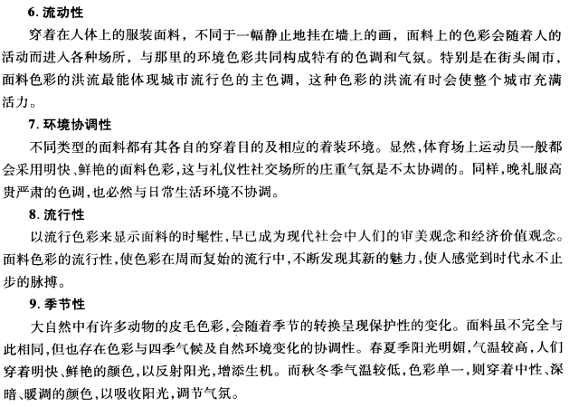 各种色彩是通过印、染、织等工艺处理方法依附于面料之上的,随着面料制成的服装再穿上人体后,团料色彩即从平面状态转变成立体状态,人们也可以从各种角度不同方位进行审美。