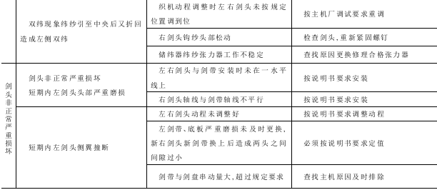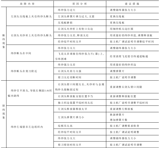 织造过程中,常出现左右剑头交接失误等纬向故障,原因多种多样,有的是调整问题,有的是剑头本身问题,现将综合情况见表13-3。