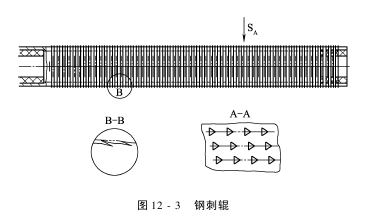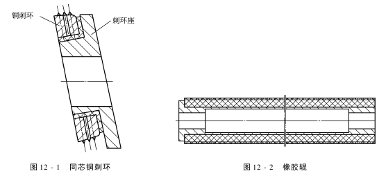 各种机型的无梭织机边撑装置应与相应的边撑匣配套,边撑匣应使织物与边撑装置圆型表面相接触,其所形成的包覆弧面应能控制布幅收缩,边撑装置上的铜刺环、橡胶辊、钢刺辊等要求(同芯铜刺环如图12-1所示,橡胶辊如图12-2所示,钢刺辊如图12-3所示)运转灵活,刺尖锋利、无弯钩、断头,露出高度应根据织物的厚度合理搭配,从低至高,在运转中能牢固地握住织物,而又不损伤织物表面,且有效地紧握布边,不让其收缩,橡胶辊、钢刺辊上的螺纹和刺尖应呈螺旋形,起到有效升幅作用,铜刺环上的刺路应呈圆形,其根据刺环座的角度变化来达到预定的升幅效果。
