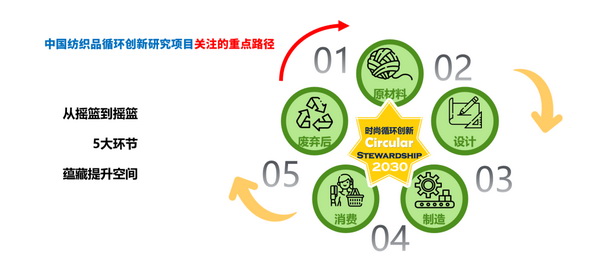 阎岩指出,“我国纺织循环经济的发展,已经初步形成了自己的模式。不可再生,原材料的替代生产过程中的节能降耗已经成为行业发展的重要方向。在整个生产环节和节能降耗和资源循环的利用,也是整个行业的工作的一个侧重领域。此外,在废旧纺织品再生利用的规范化的工作也取得了重大进展。纺织服装行业的循环转型,呈现出了由设计端到消费端开始多端转型。具体的行动从原头设计端开始寻找解决方案,逐渐从末端治理模式转向事先预防。从源头减少对环境的影响。”中国纺织品循环创新研究项目也将通过对纺织品到纺织品循环模式的基础研究分析其可行性,推产业动循环转型。
