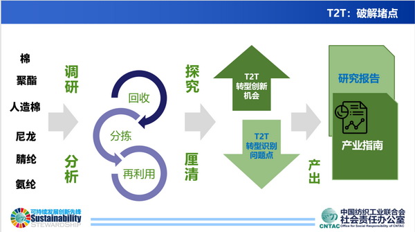 考虑到目前循环设计仍旧处于概念提出与呼吁的初级阶段,循环创新的技术、工艺和设备创新不足,缺乏顶层设计及相应的政策、配套制度和标准体系需进一步完善,并且绿色消费市场驱动力不足,缺乏推广循环时尚的专业平台和专业人才。中国纺织品循环创新研究项目为推动变革,中国纺织工业联合会社会责任办公室副主任兼可持续发展项目主任胡柯华重点介绍了项目的工作规划,分享预期目标和工作计划。本次项目重点聚焦六种主要纺织纤维材料(Cotton 棉、Polyester 聚酯纤维、MMCF 人造纤维素纤维、Nylon 锦纶、Acrylic 腈纶和Elastane 氨纶)的纺织品的回收、分拣、再利用过程中的现状与问题,探索技术创新路径和商业模式、市场机会,撰写中国T2T产业创新报告。同时,项目将为参与厂商开展能力建设,以及召开T2T产业创新报告发布会,为纺织行业循环转型提供产业全景图。