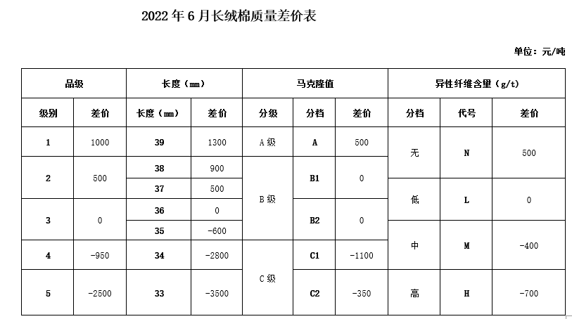 依据2022年5月的棉花公检质量数据、中国棉花协会棉花质量价差自动生成系统采集的棉花加工企业销售成交价、纺织企业监测点的采集数据,及当月的中国棉花价格指数、2022年1-5月中国长绒棉价格指数,并征求业内相关专家的意见,现做出如下调整: