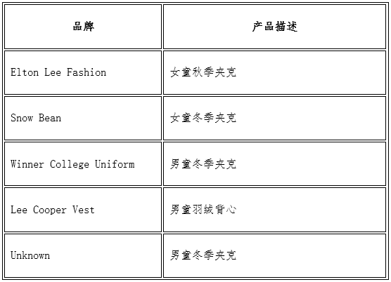 此次召回产品涉及多种型号的儿童夹克。夹克带有抽绳、纽扣等。具体召回产品信息如下: