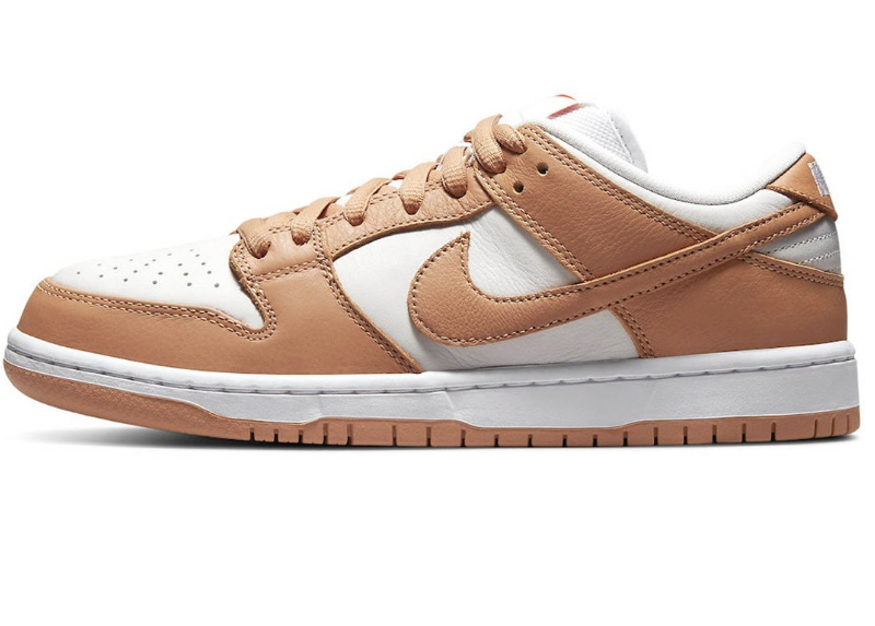 配色以 Nike SB Dunk Low 经典的双色调组合打造,鞋面基础由白色皮革制成,搭配类似原色皮革色彩的覆盖层、Swoosh Logo 以及后跟贴片。