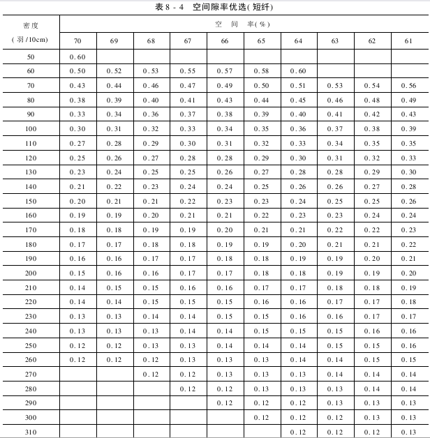 空间隙率优选63%~68%(短纤)见表8-4,仅供参考,可根据实际情况选择。