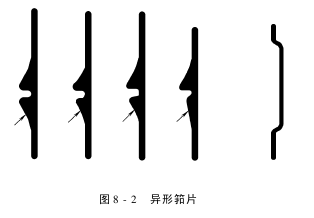 (1)异形筘片见图8-2:SUS301不锈钢制造,硬度值HV500~550,筘片的长度与筘高相关连,筘片的宽度为4mm,筘片厚度与筘号相关。筘片的形状、角度、厚度、光滑度、光洁度、气流槽形状及筘片材料都会对纱线通道及织物质量、生产效率产生重大影响。