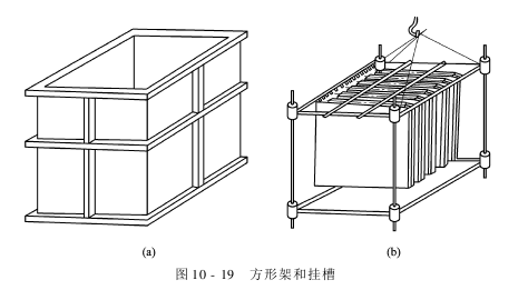 21方形架上色机 方形架上色机是由挂染槽和星形架的优点综合而成的,其作用与星形架相似,但挂绸比较方便。如图10-19所示。染槽是一方槽,吊架换成了方形架,平幅面料整匹用钢针将两边拴住,每隔数层分开挂在方形架上,每架可挂50g/m2的面料9匹(每匹长40~50m)。用电动吊车把方形架吊入染槽,每个染槽容积1800L,可把方形槽编为一组,成为一条上色生产线。其中,上色槽特意上色(上色残液可续用),后处理槽特意用于水洗及后处理,这样可大大提高生产效率。方形架上色机适用于全真丝布料的上色,其挂绸操作较星形架方便。布料呈松式平幅状态,因而不易擦伤,而且染液的渗透性良好,使上色布料光泽轻柔,手感柔软饱满。但此设备容绸量较小,产量较低,也可能产生“刀口印”等疵病。