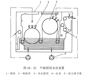 ①进布架:由导布辊、开幅辊、吸边器等部件组成。其它,可加装自动整纬装置。 ②预浸室:由数根导布辊及液槽组成,达到使面料充分润湿的目的。 ③膨化室:由四只多孔圆筒组成。布料经预浸槽浸渍后,进入膨化室,紧贴在多孔圆筒表面,利用圆筒内空气对流,使液体进一步渗透到布料纤维内部。此外,采纳围绕穿布方式,使布料在膨化室能停留较长的时间,得以充分膨化。 ④平幅圆筒水洗装置:平幅圆筒水洗装置如图10-23所示。