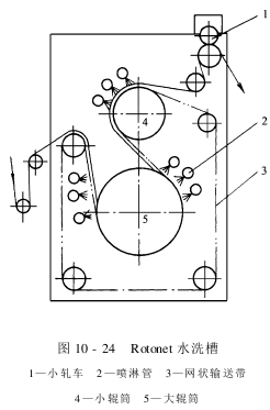水洗槽中装有两个多孔圆筒,每个圆筒设有1~2组喷淋管。通过离心泵将水洗槽内经过滤后的洗液喷向布料表面,由于具有较大的喷淋压力,使部分洗液能穿透面料,达到强力水洗效果。整个水槽为全封闭结构,进出布采纳水封口,有效地降低了能耗。布料在运行中既受到液相的作用,又受到气相的作用。温度的提高使污物分子的活动能量加大,增添了污物的扩散系数;同时由于温度的提高,水的表面张力与黏度降低,加速了污物的膨化、分别、水洗效果明显提高。 ⑤松弛式水洗槽:布料经二格平幅水洗后进入松弛水洗槽,在液流式喂布装置作用下面料松弛地堆放在上下两层输赠带之间,随输赠带徐徐前进。布料在输赠过程中受到喷淋装置的作用,从正反两面对布料进行喷淋水洗,同时喷淋作用又使面料不断保持波形休闲,并在全松弛状态下自然收缩。 ⑥轧车:在各水洗单元之间,配有轧车或高效吸水装置,能有效地提高洗液交换速度。 (2)Rotonet水洗机:Rotonet水洗机为延续式、无张力、全松式水洗机。该机由六格平洗单元、一个松式履带槽、一台真空吸水机与轧车组成。各水洗单元之间,应用张力辊调节直流电动机电压的原理,及时调整前后单元的速度,将布料的张力操纵在肯定的范围。而松式履带槽内,布料呈波浪形折叠、无张力运行,保证了整机低张力与松式的特点。 ①进布架:采纳卷装式或折叠式进布,进布架还配有自动对中装置、张力调节装置与螺纹扩幅装置。 ②Rotonet水洗槽:Rotonet水洗槽为自立式水洗室结构,如图10-24所示。