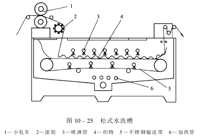 面料经扩幅后被网状运输带无张力赠入水洗室,夹在运输带与大辊筒之间,然后转绕在小辊筒上,经水洗室出口处的轧辊输出。 Rotonet水洗槽内装有三排为一组的三组喷射水管,可对布料正反两面进行直接与间接的高速喷射。高速休闲的水流在网状运输带的网孔中形成涡流,加速污物的脱落。同时,面料在水洗室内呈S形运行,形成逆流冲洗,使水洗更为彻底。轧辊位于水洗室出口处,在布料进入第二水洗室前,可挤除面料内的水分,加强水洗效果。网状运输带可使面料在不卷边、无张力、不受喷射水管的直接喷射的情况下进行水洗,布料运行平坦,没有折皱,由于布料在运输带上不受张力,而且又因面料在网孔之间形成微折皱,使布料松散与松弛,从而使水洗后的面料手感柔软。又因洗液可在网孔内产生涡流,水洗更为彻底,耗水量少。此外,浴比小,可缩短升温时间,节水节能。 ③松式水洗槽:松式水洗槽如图10-25所示。