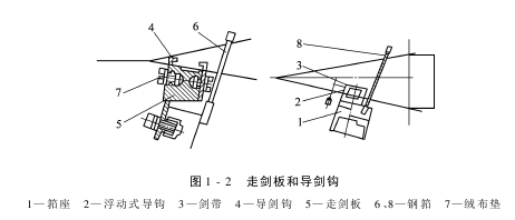 3.剑轮 剑轮往复转动,传动挠性剑带进出梭口。高速引剑时要求剑轮轻,而且有足够的强度,材料可用铝合金或用高强度贴合材料,如尼龙并以石墨碳纤维充填增强。剑轮的直径普通为250~450mm,轮齿和剑带孔两者的节距应相互配合。近年来,为提高传剑系统的传动精度,降低传剑机构对剑轮的增速传动比,趋向于用较大的剑轮。 4.导向器件 导向器件有导剑钩与导向走剑板(绒布垫)等,对于窄的剑带(16mm)两侧均使用导剑钩,较宽的剑带(24~30mm)往往仅靠织口的一侧有导剑钩。有的织机无导剑钩。剑带在梭口中的导向器件起到两方面的作用,一是稳定剑头与剑带在梭口中的休闲;二是托起剑带,减少剑头、剑带和经纱的摩擦。有的织机为减少剑带和经纱的摩擦,将导剑钩做成浮动式导钩,稍稍托起剑带,“浮”在下层经纱之上约1~3mm。如图1-2所示。