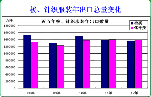 自11年以来化学纤维类工作装出口数量超过棉类,而12年工作装出口总量低于11年,且化学纤维类比例继续上升。
