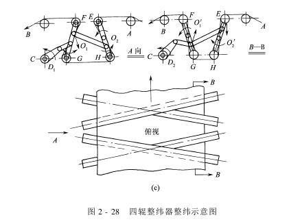 2.四辊整纬器 图2-27所示的四辊整纬器是目前国内使用较为普遍的一种。它主要由四根整纬辊与调节机构组成。各整纬辊之间分离依靠双列向心球面球轴承和两组连杆相连。 假如面料正常运行,则各整纬辊相互平行,布料左右边部在被动导布辊A与B之间的穿行长度相等,如图2-28(a)所示。在布料全幅内的经向张力大小一致。各经纱相对运行速度相等,亦即运行中的经纱各段无相对“超前”或“滞后”的现象。 当发觉纬纱向左后歪斜时,旋动手轮,使丝杆转动,带动连杆D1 、D2 分离绕O1 、O′1 点按B点方向归转肯定角度。四根整纬辊左右两端按图2-28(b)所示方向的变幻而不再平行。布料在辊A与辊B之间的穿行长度是左边缩短,右边伸长。运行布料全幅内的经向张力浮现从面料中央线向左递减而向右递增的变幻(设布料中央线和整纬辊中央线重合),摩擦力向左递减,从而引起面料中各经纱的线速度也产生向左递增、向右递减的变幻。这样,左后直线形纬斜的纬纱,在运行中逐渐恢复到正常位置。图2-28(c)所示为右后直线型纬斜整纬的情况。