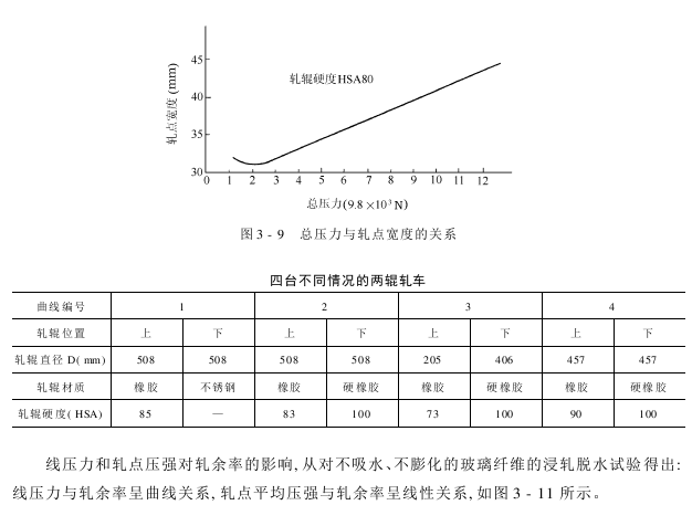 轧水机的总压力是指轧水机通过加压机构对轧辊施加的所有压力。在机台与加工面料相同的条件下,总压力在很大程度上直接影响轧余率。 轧辊轧点处单位长度上所受的压力,称为线压力。它和总压力的关系为: