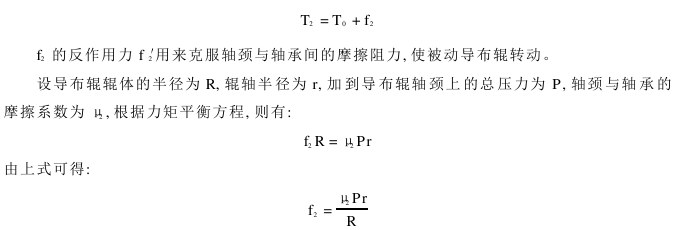 因此,平幅布料经过主动导布辊后,其经向张力将降低。平幅面料经过的主动导布辊越多,经向张力降低得也越多。 布料经向张力过小,在运行过程中会松弛,甚至产生皱褶。为了克服这种问题,有时使主动导布辊超速运行。这样,在面料和导布辊辊面之间产生肯定的打滑。 设布料和导布辊辊面间的滑动摩擦力为f4 ,打滑时布料输出端的经向张力为T′3 ,则有: