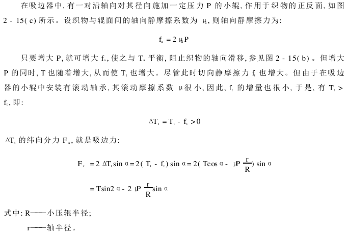 (1)使小压辊处于如图2-15(a)所示位置,α=0,分析此半幅布料受力平衡关系: 可见,忽略上式中的第二项,则当α=45°时,Fx 为大。事实上,由于第二项的存在,并考虑上述讨论中的理想化所产生的误差,α<45°时,Fx 已达到大。 由上面的分析,可以得出以下结论: ①吸边力Fx 随夹角α的增大而增大,但有一极限值,不能任意加大。考虑到吸边力过大时会引起布料较大的纬斜,普通取10°≤α≤20°。 ②要平衡Ta ,必须提供足够大的轴向静摩擦力fa ,因此P必须足够大。否则,不仅影响吸边,甚至会起皱或逃边。但是,P也不能过大。因为,P过大不仅会在面料上产生压痕,还可能影响面料纤维的坚牢度。因此,在安装吸边器时,要根据布料的品种与α角度,仔细调节小辊间的压力P。 ③辊面和布料不能打滑。因为打滑时,摩擦力的性质由静摩擦变为滑动摩擦,使fa 锐减,破坏了fa 和Ta 的平衡,吸边器无法正常工作,甚至不能工作。 ④减小轴承摩擦,有利于吸边。为此,要加强吸边器小辊转动部位的维护保养,保持良好的润滑状态。 四、吸边器的安装、使用及保养 (1)电动吸边器不锈钢辊的密封差,对温度高、湿度大、腐蚀严峻的环境适应性差。因此,定时保养很重要。普通好1~2周做一次清洁与检查工作。 (2)电气触头在使用肯定时间后,表面会变毛糙,使吸边器灵敏度下降,可用细砂皮打磨,使其表面光滑,以正常工作。 (3)吸边器的变压器是按单边头动作设计的。因此,应该使两侧机头有肯定的隔档,使面料边缘和触杆相距10~20mm,幸免两边机头同时工作而造成变压器损坏。而且,也可幸免吸铁动作频繁而大大缩短吸边器的使用寿命。但距离过大,面料简单偏移而造成脱夹。 (4)检查轧辊表面是否光洁平坦,预防布料擦伤、刮破。 (5)轴承要定期加油,并清理压辊端的纱头、尘埃、油污,预防压辊转动不灵便及在布料上产生油污斑。 (6)吸边器压辊的安装角度和布料的速度、厚薄、幅度及干湿度有关,普通小辊的轴线和布料纬向取10°~20°为宜。 (7)布料必须从切线方向通过两压辊的压点,且进出时为向来线。 (8)吸边器调幅横梁的中央离地面的高度为1.5m左右,进布辊离地高度为2~3m,出布辊离地高度约为0.5m。 (9)定期检查贮气桶、管道等是否漏气,压力表、气膜、气阀是否损伤。