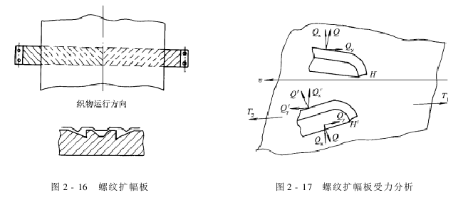 1.螺纹扩幅器 螺纹扩幅器可分为螺纹扩幅板与螺纹扩幅辊两种。 (1)螺纹扩幅板:如图2-16所示,螺纹扩幅板是一种结构容易的扩幅器。在钢质或铜质的板面上,自中心分向,左右刻有斜槽(螺纹)。斜槽和板轴线成10°~15°夹角。扩幅板通常固定在机架上,当布料从上面滑过时,扩幅板就对面料产生扩幅作用。