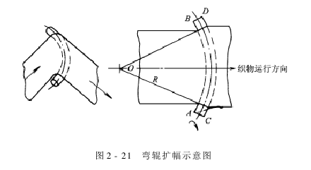 三弯辊扩幅器的装置,如图2-23所示,普通由三根相同的弯辊组成。扩幅器的扩幅量为三根弯辊扩幅量的总与。在实际使用时,可改变下方两根弯辊的相对位置或转动弯辊,改变其芯轴位置,来调节整个扩幅器的扩幅能力。