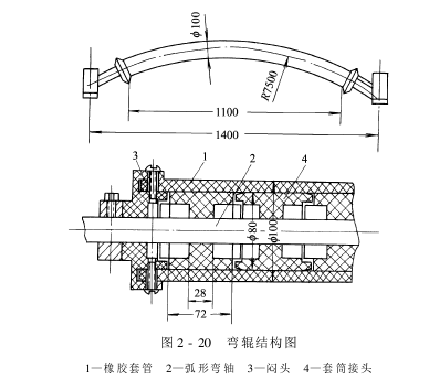 弯辊扩幅器普通由1~5只弯辊组成。在实际生产中常用的是三弯辊扩幅器。弯辊扩幅器的主要组成部分是弯辊,其结构如图2-20所示。从外表瞧,弯辊是一根尽整而具有肯定弹性的弧形橡胶辊,在布料带动下,能绕其弧形轴芯线归转。从弯辊的内部结构瞧,它由辊芯与辊体两部分组成。辊芯的中部是一根弧形芯轴,在其上通过滚动轴承安装有多节圆柱形套筒,在相邻两套筒间由各自端面上的套齿依次嵌接相连。在芯轴上套有多节胶木或铸铁衬套,并用键固定在芯轴上,可以幸免芯轴受到磨损,整个辊芯套在橡胶套中。这样,一方面可以预防辊芯的轴承漏油与多节套筒嵌接处积污;另一方面可以增大辊面和面料的摩擦,提高扩幅能力。
