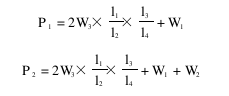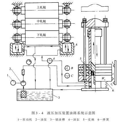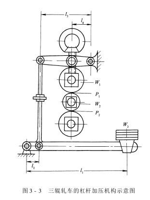 重锤杠杆加压是通过重锤、下杠杆、连杆、上杠杆、升降丝杆而加压于轧辊的。重锤的分量是有限的,通过杠杆后到底能产生多大的压力呢?我们可根据杠杆原理加以计算。图3-3所示为三辊轧车的杠杆加压机构示意图。 设W1 、W2 为上、中轧液辊及其两轴承、轴承壳的分量,W3 为重锤分量,升降丝杆与连杆都处于垂直状态,上、下杠杆及连杆、丝杆等的分量暂不计算在内,则上下两轧点的各自压力为: