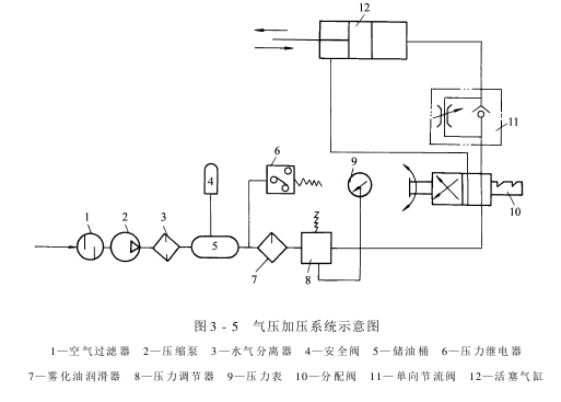 2.液压加压装置 采纳液压加压装置,克服了杠杆加压的缺点。图3-4所示为液压加压装置的油路系统示意图,其工作原理是由原动机传动油泵,将油自油槽压入油缸,再经三相阀与并联管道分离输赠至下轧辊两端轴承下方的油缸内推动活塞,顶起下、中两轧辊压向位置固定的上轧辊,尽成加压。 液压加压装置具有如下优点: (1)简单获得较高的压力:液压加压基本原理是利用密闭油液的压强传递,油液通过管道进入加压油缸中,油液的压强作用在大面积的活塞上,从而可以获得较大的压力。 (2)操作方便:液压加压利用加压油缸的活塞,在不同的压强下可以沿油缸内壁往复休闲,使轧辊两端轴承座沿机架上下滑动而进行加压与卸压。由于密闭器中的液体压强是由稳压器操纵的,所以可使轧辊两端加压均匀。采纳阀门操纵,操作也很方便。 (3)比较安全:液压加压没有气压加压那种会有造成爆炸的惊险。 (4)液压加压为了预防因漏油而引起的油压迅速下降现象,往往需要用稳压装置来保持稳定的压强。再加上液压系统的泵、各种阀类和滤油器、油箱、管道系统等,显得较复杂,设备花费较大。其它,液压系统必须有良好的密封,预防漏油及沾污布料。 3.气压加压装置 染整机械中的加压设备应用气压加压愈来愈广泛,这是因为气压加压装置具有如下优点: (1)结构容易,操作方便。 (2)空气流速快,操作时动作也快。 (3)便于远程控制与集中操纵。 (4)比较清洁,不会因泄漏而对布料造成沾污。 同时,由于空气的气压缩性,当通过轧辊轧点的布料厚度发生变幻时,气动加压的压力变幻较小。轧余率比较均匀,压力波动也小。图3-5是气压加压系统示意图。