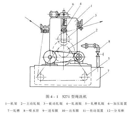 绳状水洗机是专供绳状布料清洗用的,也可用作绳状面料浸轧退浆剂、煮练剂、漂白剂等化学品溶液的设备使用。因此,它是组成绳状练漂联合机的重要单元机台。根据布料运行的张力情况,可将其分为紧式绳洗机与松式绳洗机两种。 一、紧式绳洗机 紧式绳洗机是将双头绳状布料处于经向拉紧状态下进行清洗的。绳状布料分离从左右两端进入导布瓷圈,绕过轧槽的后、前两根导布辊,进入大轧辊轧点,并由分布棒按清洗道数分开,继续归绕在导布辊和大轧辊上浸轧,普通要浸轧6~11道(即绳状布料归绕6~11圈),后双头绳状布料在大轧辊中部经喷洗后进入上轧液辊轧点,再次轧除洗液,然后从大轧辊中部分头,经导布瓷圈出布。紧式绳洗机的工作效率较高,车速普通可达95~180m/min,结构较为容易。 紧式绳洗机的型式较多,但其结构原理基本相同。现选择5271型绳洗机进行介绍,如图4-1所示. 1.机架(又称墙板) 它是支撑轧辊轴承与承受机件分量与机器在运行过程中所产生的力矩的机件,因此必须具有足够的强度与刚度,幸免震动与损坏。机架常采纳HT15—33铸铁制成。其滑道和轴承壳的配合选用较松的动配合,应和机架底平面垂直,以保证左右轴承壳在滑道上自由上下挪移。 2.主、被动轧辊 它是紧式绳洗机中的主要机件,也是易损坏件。主动轧辊外径为500mm。辊体可用铸铁制成,亦可用12~16mm的20#钢板卷成。辊体外圆车制倒顺螺纹,再包覆乳白色橡胶层,橡胶层厚度为16~20mm,硬度为HA(80±3),表面精度要求不高。轧辊轴芯采纳45#钢,有通芯轴芯及不通芯轴芯两种。轴芯一端连接传动件。被动轧辊外径为400mm,表面橡胶硬度为HA(80±3),两端轴对称,其余结构和主动轧辊相同。 辊体假如是钢板卷制焊接的,需经定性处理,以去除内应力。否则使用肯定时间后,由于在轴芯焊接处应力集中,有可能发生断裂。 3.轧液辊 轧液辊的作用是绳状布料经多次浸轧后再次轧液,以降低轧余率。轧液辊外径为200mm,辊面包覆白色橡胶,硬度为HA(80±3)。辊体用铸铁或无缝钢管制成,两端以滚动轴承和通芯轴连接。因芯轴固定而辊体转动,故亦称为活络辊筒。 4.导布辊 在轧槽内装有两根导布辊,用来诱导绳状面料浸渍。导布辊直径为200~250mm。辊体用无缝钢管制成,两端用闷头板(A3钢)焊接密封,闷头板中央镶焊不锈钢短轴。辊面及两端均包覆硬橡胶层10mm左右,精度要求不高。