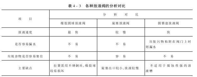 圆锥盘放液阀的材料,可根据工艺要求而定。如冷热水槽,可采纳HT20—40或ZH62材料;碱性液槽,可用HT20—40材料;酸性液槽,可用ZH62材料;不锈钢制的水槽,其圆锥盘放液阀的阀座材料采纳不锈钢,其阀芯材料可采纳橡胶,这样可预防渗漏。 圆锥盘放液阀的配合锥度常取1∶1.2(1∶1.0或1∶1.5均可),加工后需用研磨砂研磨,圆锥表面不得有气孔或砂眼,并做渗水试验,要求不漏。 (2)旋塞放液阀:如图4-5所示,普通为铸铁制成,其配合锥度为1∶7,光洁度及技术要求和圆锥放液阀相同。 (3)橡胶圆球放液阀:它用于不锈钢水槽,如图4-6所示。在不锈钢槽的出液口,置一个软橡胶球,球的外径应比出液口内径大些,圆球两端和出液管上均有圆柱销钉,销钉间装两根不锈钢拉簧,以弹簧拉力将圆球紧紧阻塞放液口。放液时,操作人员将圆球拉离放液口即可。这种结构适用于冷水或温水槽。各种放液阀的分析对照见表4-3。