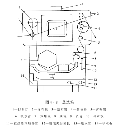 在松式平洗机的末级装有一个强制冲吸机构(图4-14)。它由双层尼龙衬网、喷淋管与多孔吸口组成。布料导入两层履带形尼龙衬网后,两面由上下喷淋管强制冲洗。布料中的洗液,则由多孔真空吸口吸去,达到提高清洗效率的目的。