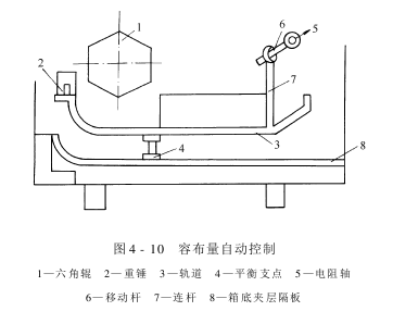 为了保证每格洗液槽同步,必须操纵每格的容布量。图4-10所示是容布量自动操纵的原理图。调节重锤,使之和设定的容布量平衡。当容布量发生变幻时,堆布轨道就会绕支点上下摆动,通过连杆、挪移杆,把这种摆动转换为电阻轴的圆周休闲,使电阻发生变幻而调整车速的快慢,达到容布量自动操纵的目的。 图4-11所示为松式转轮式平洗机,此机结构容易,操作方便,适用于中长化学纤维混纺化纤织物面料的退浆与平洗。图4-12所示是它的单元结构图。布料由六角导布辊摆入小翻板,堆置36s后落到转轮的叶片上,叶片共有10片,长度为90mm,转轮空心轴直径为300mm,轴面弥漫圆形小孔,便于洗液交换。布料在转轮槽中浸泡清洗3min后,经螺纹扩幅辊、整位器,进入主动导布辊,成S形运行,进入下一格。