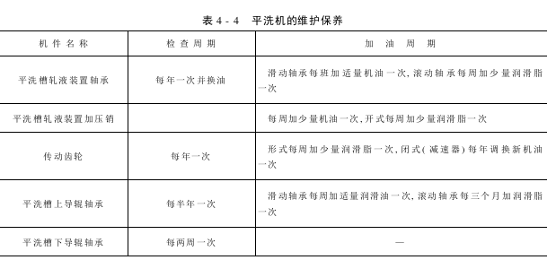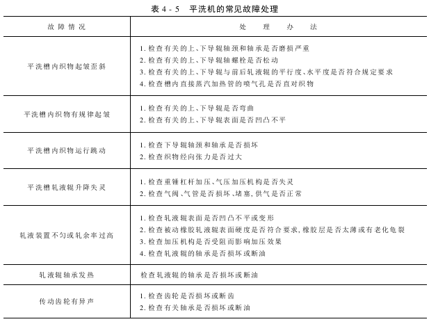①面料横穿、洗液逆流:面料自槽底进入洗槽后,在导辊间由下而上横穿运行。用泵将出口处污物浓度低的洗液,经汽水混合器加热后,赠往浸渍槽中冲洗,并以逆流方式流经各层面料。由于横穿运行的面料在导辊间多次改变运行方向,致使自槽顶向下冲洗逆流的洗液,借其贯流作用,能反复多次地从正反两面透过面料,有利于洗液充分逆流与面料上洗液交换,耗水少、净洗效率高。 ②常压液封热洗:洗槽基本密封,面料进口采纳水封。除用汽水混合器加热冲洗的洗液外,在洗槽底部有直接蒸汽管加热。槽内洗液可接近常压下沸点水温。 ③多浸多轧:槽内除装有小型浸渍槽与轧辊外,实际上,每根导布辊与防皱弯辊都有肯定的挤液作用,故布料是在多浸多轧与洗液清浊分流的情况下净洗的。 ④低水位、小浴比:洗槽底部的大洗液槽液面高度仅230mm,容量较小;小浸渍槽的容量则更小。因此,洗液更新快,有利于布料上的污染杂质向洗液扩散。 由此可见,一台高效平洗机,往往是多方面综合考虑后改进设计的。 平洗机的普通维护保养与常见故障处理见表4-4与表4-5。