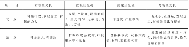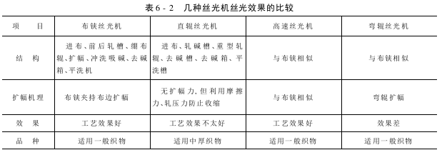 布料经过进布装置及弯辊扩幅后,进入丝光机的碱液浸轧槽,利用槽内轧液装置及上下直辊间的轧压作用,使烧碱溶液在多浸多轧的状态下渗透进面料,然后轧去多余碱液后,进入有上下罗列的软、硬直辊的冲洗去碱槽内,通过槽内喷淋的热水及热淡碱液去碱,后进入去碱蒸箱及平洗机去碱。 直辊丝光机无扩幅作用,它是利用面料紧贴在直辊表面,靠摩擦阻力预防面料纬向收缩。 所以扩幅效果差,但其可以双层加工,丝光均匀,设备占地面积小,操作方便。 为了适应高效、高速与延续化的要求,使用布铗丝光机时,以下几点应予重视: (1)必须保证布铗扩幅淋吸前布料有足够的带碱时间,增添绷布辊的直径与数量,并有良好的浸轧渗透效果。 (2)适当增添淋吸装置的数量,并加装淋液幅度操纵装置。 (3)改进布铗的材料与结构,增强布铗链的强度,增大布铗长度与开铗盘的直径。 (4)减轻高速运行的布铗链和轨道、开铗盘间的磨损。 (5)提高去碱蒸箱、平洗机的去碱效率。 (6)采纳适当的传动方式,以适应高速运转并有可靠的线速度调节装置与有关的电气装置,以便灵敏地自动调节各单独传动的单元机间的线速度。 此外,还有高速直辊丝光机及布铗—直辊联合丝光机,这里不再介绍。常用的几种丝光机丝光效果的比较见表6-2。