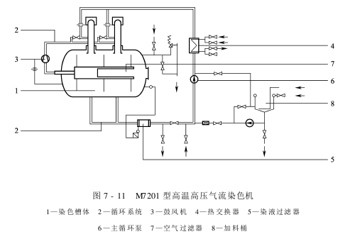 先将针织物物卷绕在表面弥漫小孔的空心卷轴经轴上,赠进卧式圆筒状不锈钢壳体内,密封加压上色,然后进行处理。染液由离心泵输赠,通过经轴,向布料层做自内向外或自外向内的循环。 如操作不当,这类上色机会产生布料层内、外与边中部的颜色差异。 在高温高压上色机的基础上又研制开辟出一种新型的高温高压气流上色机。该机采纳气流雾化染料与输赠面料,使面料带液做延续快速休闲,从而大大降低浴比,大幅度减少染化料的消耗与工业废水。采纳此上色机上色周期短,上色效果好,对面料无损伤,染后布料不产生褶皱痕,且手感极佳。图7-11所示M7201型高温高压气流上色机是国家“新型染整设备及工艺技术一条龙项目”中的专项产品,由邵阳第二纺织机械厂研制。