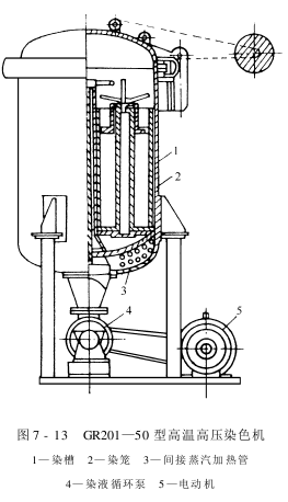 2.GR201—50型高温高压上色机 如图7-13所示,高温高压上色机主要用于染聚酯纤维散纤维、聚酯纤维毛球及聚酯纤维绞纱。聚酯纤维普通在130℃左右进行上色。在此温度下上色,其匀染性与上染率都比较理想。GR201—50型高温高压上色机有3个染笼,可装散纤维100kg或绞纱50kg。上色时,将纤维装入染笼,装满后用吊车将染笼吊入染槽中,盖好密封盖,开动循环泵使染液循环,升温上色,染毕放去残液,注入清水清洗纤维,开启顶盖,吊出染笼,取出纤维。