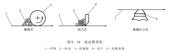 在树脂后整理与其他加工过程中,若轧余率过高,在预烘时易发生泳移现象,并产生大量表面树脂,同时也增添了烘燥设备的负担。但轧余率过低,轧辊压力太大,又会影响面料的手感。为了降低布料的带液量,正在进行低给液率的研究,可使布料上的带液率在40%左右。办法主要有泡沫后整理法、刻纹辊给液法、喷雾给液法、单面给液辊法与轧吸法等,如图9-17所示。泡沫后整理法就是一种很好的低给液办法。泡沫后整理是20世纪70年代兴起的一种染整加工新技术。它是利用机械作用让后整理剂与助剂产生泡沫,并涂敷于布料上,获得所需效果的一种低给液技术,显著地节省了能源与染化料,降低了耗水量,降低了污染,减少了设备投资,提高了产品质量。