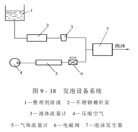 泡沫后整理机主要包含发泡与涂敷两大系统,附以必需的自控装置,可用于树脂后整理、柔软后整理及上浆后整理等。 11发泡设备 如图9-18所示。气路与液路均能通过电动调节阀操纵流量,流量的大小可从流量计得出,从而获得所需的气、液比。