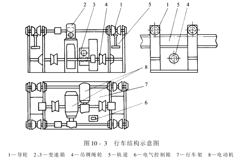 挂练槽普通由练槽、行车、升降机构、挂绸架等组成。 ①一般练桶:一般练桶为不锈钢板制成的长方体槽,以往大多为木制或瓷砖砌成,又喊做船型槽。桶宽120~130cm,桶深视面料门幅而定,约140~180cm,长度则根据所需容积与同意占地面积而定,普通为220cm,容积有3200L、4000L、4600L不等。桶底有直接蒸汽加热管,蒸汽管上面安装一块均匀弥漫小孔的花板假底,使蒸汽加热时不致直接冲击布料。按照练漂工艺的要求,练桶罗列普通为7~9个直排成一条龙。 ②夹层练桶:当练桶底部的蒸汽管加热时,练液上升,使面料浮起,产生擦伤与折皱印,且练桶上下存在温差,可以采纳夹层练桶。夹层练桶是在一般练桶的两边距桶壁4~5cm处,加装一块约2mm的不锈钢挡板。挡板下沿距桶底约20~30cm,使和桶壁间形成夹层。挡板上沿浸没在液面之下,略高于面料上沿。在每边挡板和桶壁的适当位置安放一根直接蒸汽管。布料精练时,关闭底汽,仅用夹层蒸汽保温。由于夹层蒸汽管的蒸汽喷出口都向上,蒸汽喷出时,驱使练液由底部涌入夹层,从夹层的上口溢出,流向练桶中心,形成自上而下的流向。这同原来使用底层蒸汽管时的自下而上的练液流向恰好相反。但夹层练桶使用不当时,也可能使液涌出现“短路”,即液流不从每匹布料页间穿过,而从匹和匹间流过,并使布料各页闭合,反而影响精练均匀程度。 (2)行车:行车是布料精练过程中的运行构件,它主要由导轮、绳轮、变速箱、轨道、行车架与电气操纵系统组成,见图10-3。