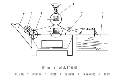 ②轧水打卷:轧水打卷机由水槽、扩幅辊、轧水辊与传动装置等组成,见图10-4。轧水是在平幅轧水机上进行的。操作时两辊自然接触,布料需预先缝接好,依次无压地浸在清水池内,然后平坦无皱地通过轧点被卷在卷布轴上,桑蚕丝薄面料普通不加压水辊,预防坯绸产生松紧,经轧水机后造成压刹印疵病。所以,轧水工艺实为打卷。较厚的面料等可加压水辊,普通用于纺类、斜纹类、缎类面料。它可以预防皱印,但简单产生卷边与皱条等疵病。 ③真空吸水:真丝布料往往在烘干前先通过真空吸水。当布料平坦地通过吸水机的吸缝口时,缝口管内的负压就把水从布料表面与纤维间的隙缝中吸走。 挂练工艺的主要特点是:设备容易,投资少,操作方便;适用于小批量、多品种的生产,产品质量较好,产量较高。但由于它属于间歇式生产,劳动强度大,由于面料以圈码或S码形式处理,内外层不易均匀一致,特别是加工厚重强捻真丝布料时,其修复率较高。