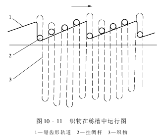 在喷嘴的出口端装有一块可自由转动的弹性弧形钢板(称为成环器),在初始状态下,由于重力的作用,成环器垂直向下,当挂绸杆前进到和成环器接触后,逐渐被抬起,布料从成环器圆弧表面滑过,悬挂在挂绸杆上,当挂绸杆继续前进一个节距(30mm左右),和成环器脱离接触,成环器在重力作用下转归到初始的垂直位置,这时,面料在液力作用下继续从喷嘴沿着成环器圆弧表面进入练槽,从而形成一个悬环。当第二根挂绸杆运行到喷嘴下方时,上述过程重复进行形成第二个悬环。依次重复动作,布料在练槽中就重复形成长环状,并随着挂绸杆在练槽中继续前进。进布速度与练液流速的大小可调节到和挂绸杆运行速度相匹配,以达到能够形成所要的悬环长度。显然挂绸杆速度越慢而进布速度越快,成环长度就越长。 ②挂绸装置:挂绸装置包含挂绸杆、锯齿装置及链轮链条机构等。挂绸杆由位于两侧的链轮链条机构驱动。链条为扁平状,挂绸杆插入链条中间的长圆形导槽内,循环链条由链轮传动缓慢地向前挪移,挂绸杆也就随着链条一起挪移,其运行速度在10~25m/min的范围内可调节,挂绸杆是一椭圆形空心不锈钢管,挂绸杆之间相隔距离10mm,练槽中可容200根挂绸杆,精练槽容绸量约为400~500m。挂绸杆在链条夹持下向前挪移的同时在垂直方向还受到锯齿轨道的支撑作用,如图10-11所示。 当挂绸杆向前挪移时,借锯齿形轨道的支撑作用,先沿着齿形斜面升高,当达到高点时(平移330mm,升高40mm),就随着齿的垂直面蓦地下降,挂绸杆因重力作用而蓦地下落,因挂绸杆与挂在杆上的布料,所受到的气体浮力不同,因而两者的下降速度也不同,故能使面料瞬时脱离挂绸杆,当面料再次挂到杆上时,使绸和挂绸杆的原接触点改变,或者使绸和挂绸杆之间松动一下,便于练液渗透,这样,精练槽有二十多个锯齿,每经过一个锯齿,绸匹就改变一次接触点或松动一次,幸免了绸匹长时间紧贴挂绸杆而产生生块等疵病。