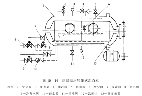 高温高压解捻松弛转笼式起绉机主要由筒体转笼、传动部分以及加液、加温系统与自动程序操纵器等组成,见图10-14所示。