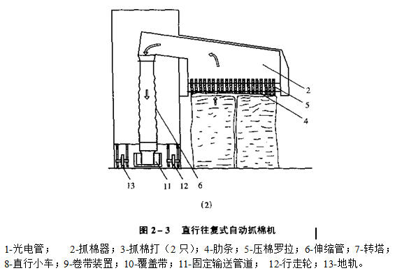 (二)FA006型、FA009型系列往复直行式抓棉机 reciprocated plucker 1、组成:主要由抓棉器2、直行小车8与转塔7等组成。工作特征: 抓棉器沿两条地轨13做往返直行休闲。 抓棉打手3能在直行小车做往返双向行程时抓棉,也能在直行小车单向行程时抓棉。小车走到一端调向时,抓棉器即下降一个抓棉深度,下降量在2~10㎜可调。 棉包可铺放在地轨的两侧,每侧棉包可分成四组,组间约间隔1米。当一侧在进行抓棉时,另一侧面可铺放棉包。如将转塔相对于小车调转180°角,就可在新的一侧继续抓棉生产。 固定输赠管道11位于两地轨之间,由钢板制成。为了适应小车行走输棉的需要,矩形管道的上边敞开采纳一根平带覆盖。覆盖带10一端固定,另一端联结在小车卷绕轮上,随小车的挪移做收放带的动作,使输赠管道的长度随小车位置挪移而变幻。且新铺棉包的高度差异不超出300㎜时,抓棉机能自动将其拉平。 FA006型系列的产量在1200㎏/h以上,可根据开清棉生产线作自动调整。每侧可分2~4组,罗列不同原材料的棉包。工作时作自动分组抓取,FA006C型可实现一台抓棉机同时供应两条开清棉生产线。当不同高度的棉包需要同时生产时,可以分组罗列并由抓棉机在抓取时自动寻平( 即对较高的棉包在肯定次数内增添抓棉罗拉的抓棉深度,直到使其达到正常棉包高度 ),终同时抓尽棉包。但平包过程是往复抓棉机混棉质量的不稳定时期。因平包过程中,某种成分是超量抓取或某种成分的空缺同时存在,棉束开松度也不稳定。 被抓取的棉束经输棉管道,借前方凝棉器或输棉风机产生的气流赠至前方机台。