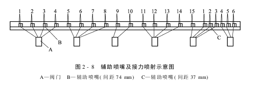 辅助喷嘴在筘座上的分布如图2-8所示,普通情况下,辅助喷嘴以5个为一组,也有2个、3个或4个为一组,每组喷嘴受控于一个电磁阀。因此,同组几个辅助喷嘴的开闭时间是一样的。辅助喷嘴数和筘幅有关,各组喷嘴喷射时间互相衔接,各喷嘴间距通常为60~80mm,标准设定80mm。