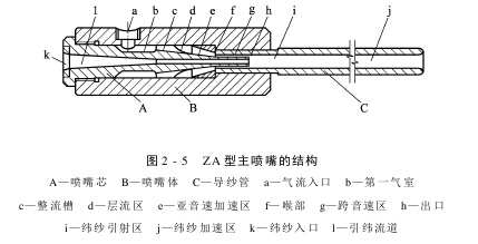 导纱管C为变截面管流流道,一端插进喷嘴体,和喉部相连,另一端伸入大气,并对准筘槽,喷嘴芯A的头端成圆柱状,伸进导纱管腔,和导纱管内壁形成圆环状缝,气流自出口h涌出时,速度已接近音速以便能在纬纱引射区i内形成有力的引射区而将纬纱引入喷嘴内,高速气流在较长的导纱管C内对纬纱进行充分作用使纬纱获得足够高的速度飞进梭口。