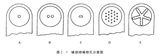 由于各种辅助喷嘴在其气流进口处的管径、管子长度、压扁形状、孔数及孔径等都存在着差异,在供气压力相同的条件下,各种辅助喷嘴的出口风速不完相同。在生产中,单孔与多孔都得到了广泛的使用。日本津田驹系列采纳单孔辅助喷嘴、丰田JA采纳双孔,而欧洲各国多采纳多孔的辅助喷嘴。辅助喷嘴喷孔示意图见图2-7。